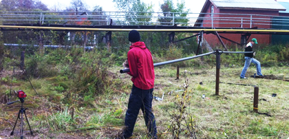 В назначенный день специалисты на участке производят планировку и вынос размеров в натуру. Определив точное место для монтажа, начинается установка винтовых свай.
